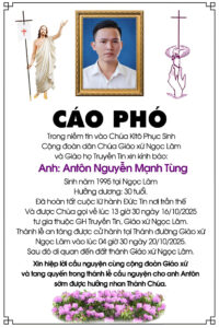 Anh Antôn Nguyễn Mạnh Tùng 30 tuổi, Giáo họ Truyền Tin, Qua đời 16/10/2025, Thánh lễ an táng 4h30 thứ hai 20/10/2025