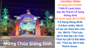 CHƯƠNG TRÌNH TUẦN IV MÙA VỌNG NĂM A – 2026 ĐẠI LỄ GIÁNG SINH NĂM 2025 GHBL BÀU MÂY CHƯƠNG TRÌNH TUẦN IV MÙA VỌNG NĂM A – 2026 ĐẠI LỄ GIÁNG SINH NĂM 2025 I. GIỜ LỄ: – THỨ HAI VÀ THỨ BA NGÀY 22/12 – 23/12/2025: + Sáng: lễ 04h30 + Chiều: Lễ Lúc 18h15. – THỨ TƯ NGÀY 24/12/2024: + Sáng: Lễ 04h30 + Chiều: Canh thức Giáng Sinh vào lúc 18h15.