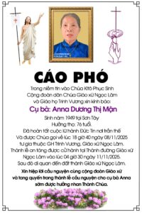 Cụ Bà Anna Dương Thị Mận 76 tuổi, Giáo họ Trinh Vương, Qua đời 08/11/2025, Thánh lễ an táng 4h30 thứ ba 11/11/2025
