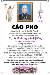 Cụ cố Maria Nguyễn Thị Hằng 89 tuổi, Giáo họ Vô Nhiễm, Qua đời 24/02/2026, Thánh lễ an táng 4h30 thứ sáu 27/02/2026