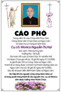 Cụ Cố Monica Nguyễn Thị Hạt 102 tuổi, Giáo họ La Vang, Qua đời 01/12/2025, Thánh lễ an táng 4h30 thứ năm 04/12/2025