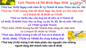 | Thứ ba 17/02/2026 | Mùng một Tết Bính Ngọ Thánh lễ cầu bình an cho năm mớI vào lúc 4h30 |