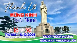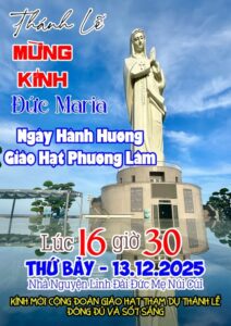 Kính mời quý cha, quý tu sĩ nam nữ, quý cộng đoàn dân Chúa tham dự Thánh Lễ hành hương của giáo hạt về Trung Tâm Hành Hương Đức Mẹ Núi Cúi thay cho giáo phận. Lúc 16 giờ 30, Thứ Bảy ngày 13/12/20254. Thánh lễ tại nhà nguyện dưới linh đài Đức Mẹ Núi Cúi.