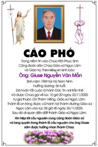 • ← Bà Anna Nguyễn Thị Hằng 55 tuổi, Giáo họ Trinh Vương, Qua đời 21/11/2025 và Ông Giuse Trịnh Văn Mạnh 65 tuổi, Giáo họ Mẹ Thiên Chúa, Qua đời 22/11/2025, Thánh lễ an táng 4h30 thứ ba 25/11/2025