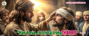 Khi ấy, Chúa Giêsu đi qua, thấy một người mù từ khi mới sinh. Người nhổ xuống đất, lấy nước miếng trộn thành bùn, rồi xoa bùn trên mắt người ấy, và bảo: “Anh hãy đến hồ Silôe mà rửa” (chữ Silôe có nghĩa là được sai)”. Anh ta ra đi và rửa, rồi trở lại thì trông thấy được.