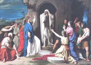 Mộ đó là một hang nhỏ có tảng đá đậy trên. Chúa Giêsu bảo: “Hãy đẩy tảng đá ra”. Martha là chị người chết, thưa: “Thưa Thầy, đã nặng mùi rồi vì đã bốn ngày”. Chúa Giêsu lại nói: “Ta đã chẳng bảo con rằng: Nếu con tin, thì con sẽ xem thấy vinh quang của Thiên Chúa sao?” Thế là người ta cất tảng đá ra. Chúa Giêsu ngước nhìn lên và nói: “Lạy Cha, Con cảm tạ Cha đã nhậm lời Con. Con biết Cha hằng nghe lời Con. Nhưng Con nói lên vì những người đứng xung quanh đây, để họ tin rằng Cha đã sai Con”. Nói rồi, Người kêu lớn tiếng: “Ladarô! Hãy ra đây!” Người đã chết đi ra, chân tay còn quấn những mảnh vải, trên mặt quấn khăn liệm. Chúa Giêsu bảo: “Hãy cởi ra cho anh ấy đi”.