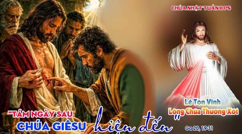 Tám ngày sau, các môn đệ lại họp nhau trong nhà và có Tôma ở với các ông. Trong khi các cửa vẫn đóng kín, Chúa Giêsu hiện đến đứng giữa mà phán: “Bình an cho các con”. Ðoạn Người nói với Tôma: “Hãy xỏ ngón tay con vào đây, và hãy xem tay Thầy; hãy đưa bàn tay con ra và xỏ vào cạnh sườn Thầy; chớ cứng lòng, nhưng hãy tin”. Tôma thưa rằng: “Lạy Chúa con, lạy Thiên Chúa của con!” Chúa Giêsu nói với ông: “Tôma, vì con đã xem thấy Thầy, nên con đã tin. Phúc cho những ai đã không thấy mà tin”.