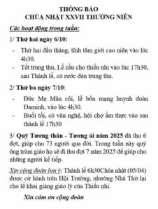 - Chúa Nhật 27 Thường Niên 05/10/2025 Mừng Kính Trọng Thể Lễ Đức Mẹ Mân Côi. Bổn mạng Giáo họ Mân Côi, Quý Dì Tu Xá Đaminh, Huynh Đoàn Đaminh và Gia Đình Mân Côi