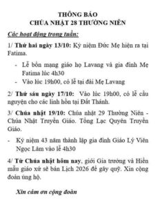 THÔNG BÁO CHÚA NHẬT 28 THƯỜNG NIÊN
